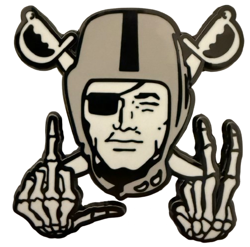 The iconic raiders logo with skull hands throwing up the LV. Hard enamel pin with a black base and grey and white filling. Double clutch in the back to secure the pin and ensure it doesn’t spin!