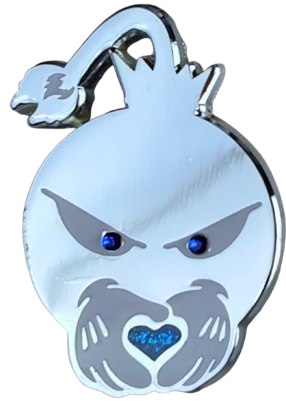 Our iconic logo with a small twist. Baby blue rocks in the eyes, baby blue glitter heart, and a silver base. Pin includes: